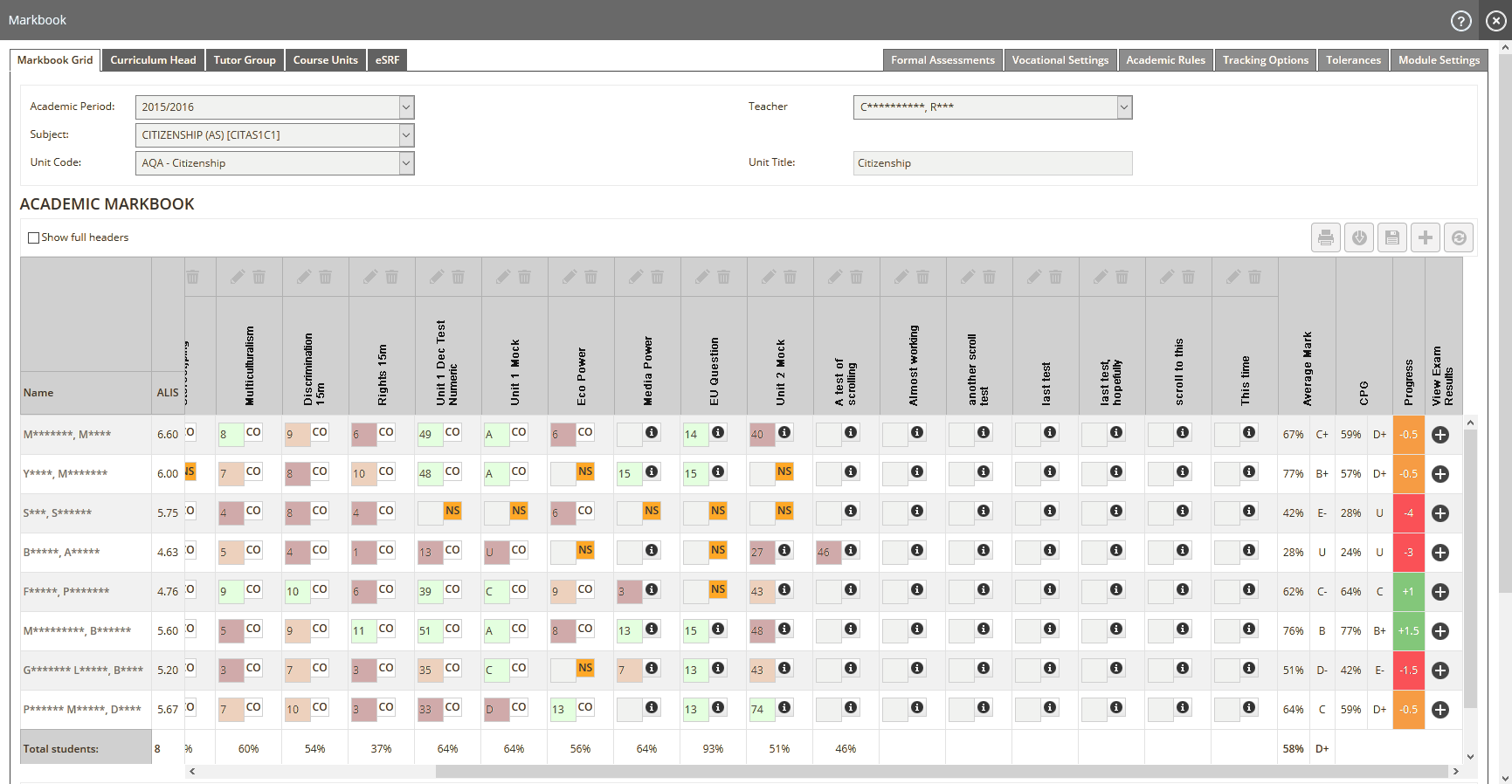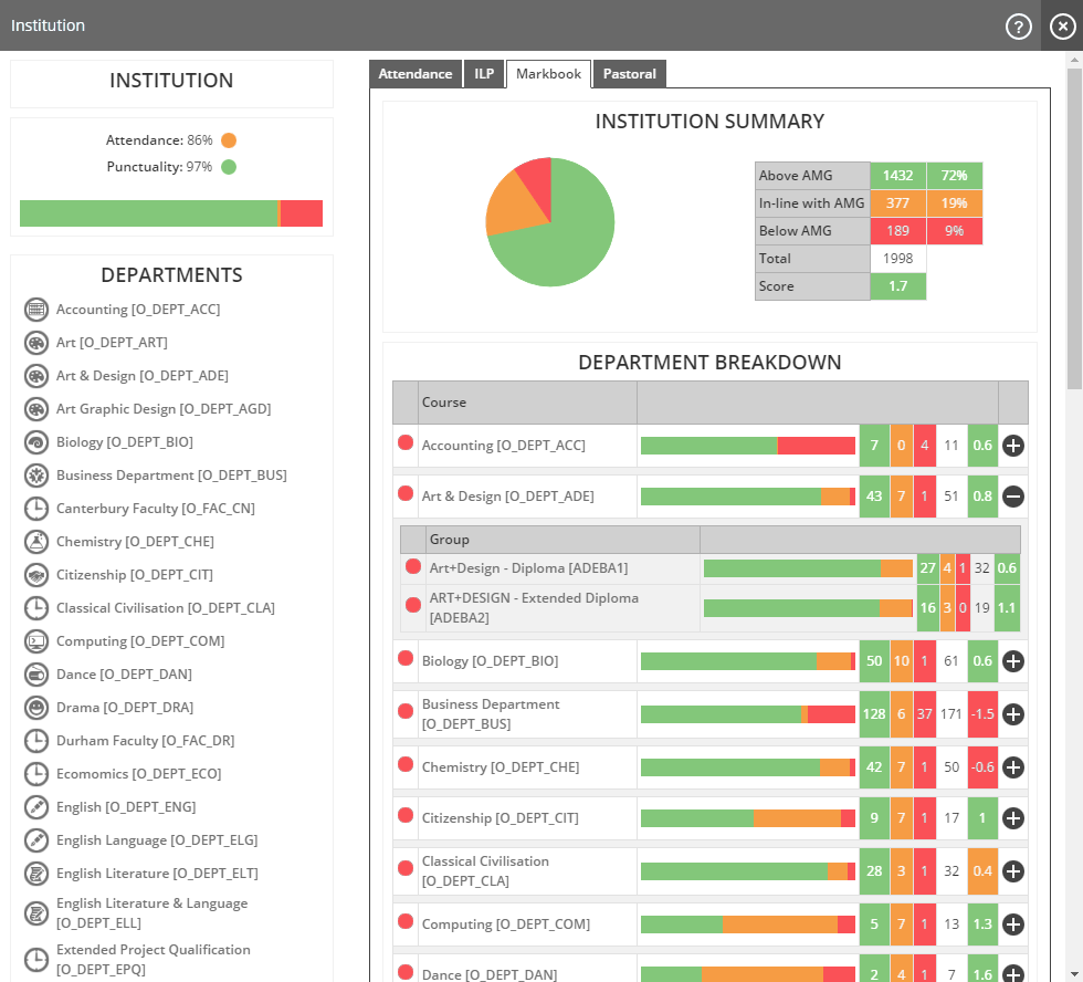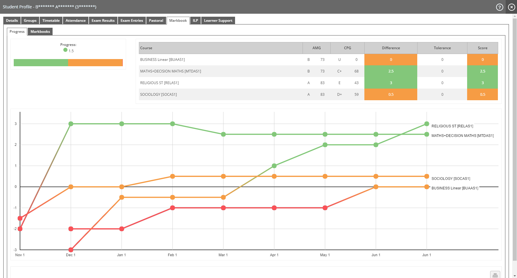 Core Modules Home / Core Modules / Markbook DashboardMarkbookILPPastoralLearner SupportReferencesFeedbackMessagingReporting Dashboard Markbook ILP Pastoral Learner Support References Feedback Messaging Reporting Markbook The Markbook module is a fully comprehensive academic and vocational assessment recording and monitoring system, including tracking functionality, which provides clear visual displays of learner progress data at aggregate and ground level. Key Features Comprehensive record of all academic and vocational marks and assessments Easy to understand target grade and student progress tracking functionality Powerful tool for early intervention and support strategies It provides flexible ways of recording academic marks and calculating averages at student, topic and group level, providing powerful information for early intervention strategies. The tracking system gives easy access to learner performance at individual and group level against target grades. For vocational curriculum, the Markbook module provides a user-friendly interface to record unit grades calculated from passed criteria and the system automatically generates vocational Student Report Forms (SRFs), helping heads of departments to review individual student and group level achievements, facilitating better management of performance.